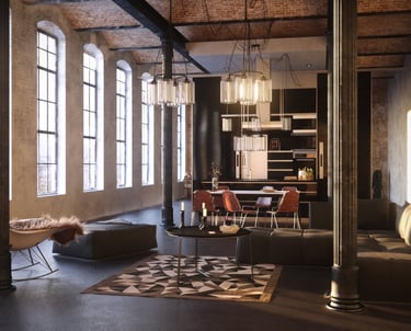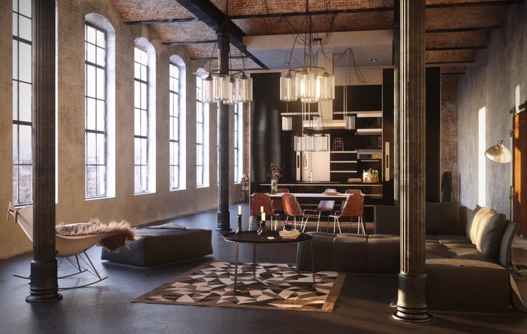 Endüstriyel tasarım, fabrika ve depo gibi endüstriyel mekanların estetiğini iç mekanlara yansıtır. Sert malzemeler, açıkta kalan yapısal unsurlar ve minimalist mobilyalar kullanarak sanatsal ve endüstriyel bir tarz oluşturur.